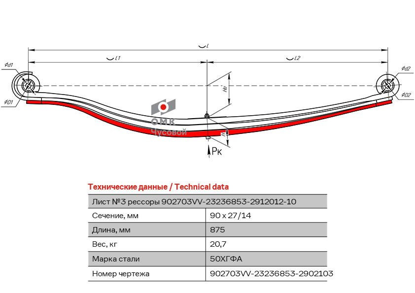 Лист Рессоры №3 передняя для Volvo FH, FM 3 листа(902703VV-23236853- 2902103) (П4249)